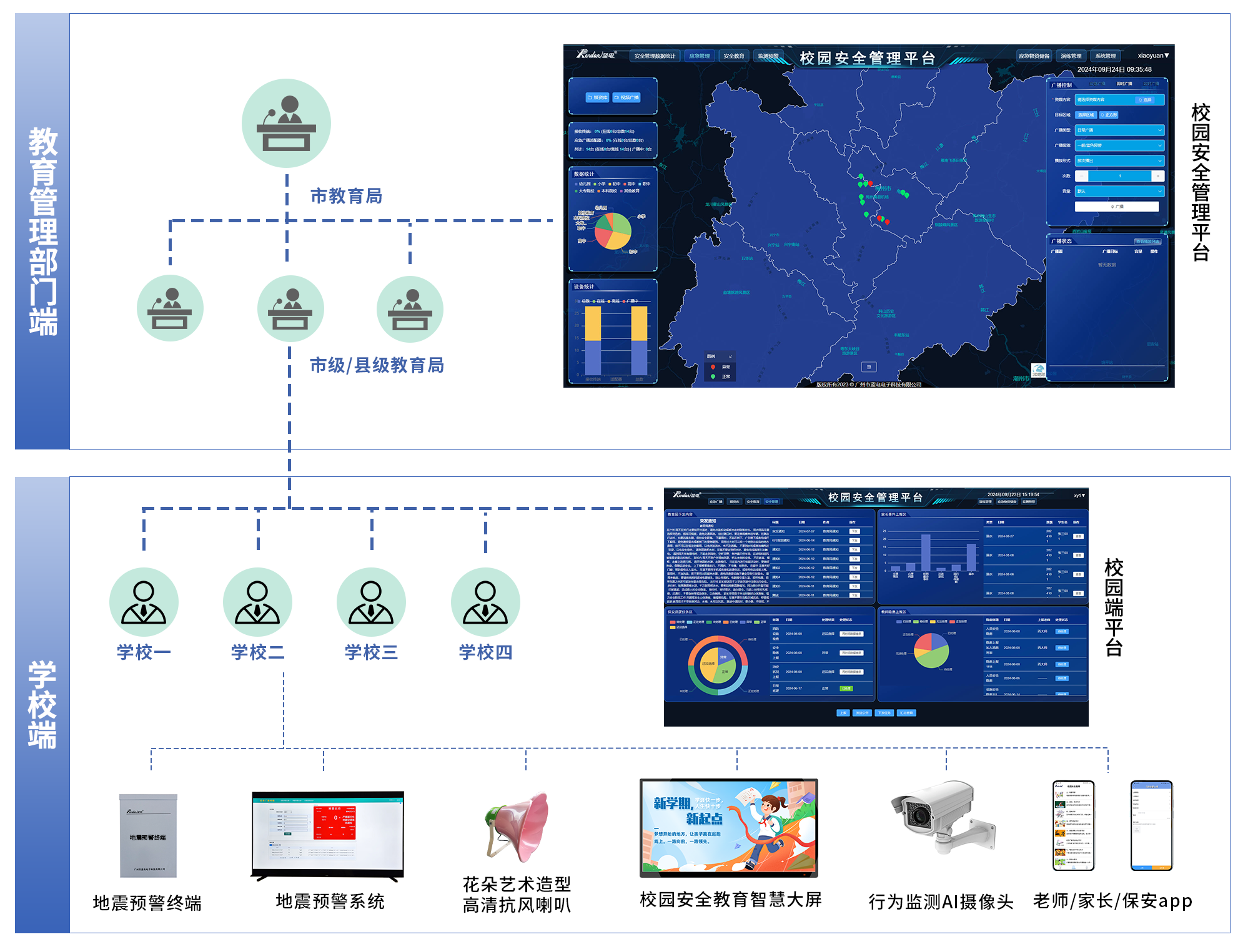 蓝电科技校园应急安全管理系统采用 “教育管理部门端 - 学校端” 两级架构 ,构建起覆盖区域监管、校内管理、终端感知的校园安全治理体系,实现 “监测 - 预警 - 处置 - 复盘” 全流程闭环管理。